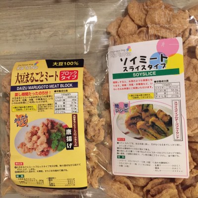 平日多見急凍素肉,第一次見到這種大豆肉乾像發現新大陸似的,怎料奶奶說這種台灣出產很多很普通的,平時也有煮給我們吃啊⋯⋯ 包裝上沒標明「國產」「日本制」,總覺得是由台灣出口到日本包裝的,我想下次也不會到樂天買了。專家指導這種要先泡水再煮,口感會比急凍好的,煮法也較多。