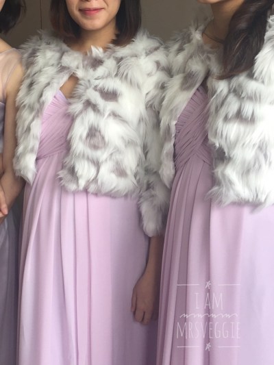 誰料到一月氣溫二十度… 不過一早一晚還有點涼意,姐妹們投票選了這件灰白拼色毛毛外套。沒純白色的平淡,而且之後可配搭日常服飾,最重要和紫色的姐妹裙很配呢!Mr Veggie還讚這件毛毛讓我們造形更顯高貴。(沾沾自喜中)